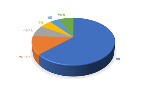 2019年の出荷量のシェアを国別に見てみると、1位は、中国で全世界出荷量の63%を占めた。2位はマレーシアだが、かなり距離を空けて、シェアは約20%だった。